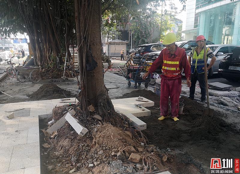 上午10點(diǎn),深圳市交通運(yùn)輸局執(zhí)法人員來到福田區(qū)民田路與福華路路口的一處施工現(xiàn)場。記者在現(xiàn)場看到,沿著福華路一側(cè)的人行道基本全部被挖開,建筑工人正在進(jìn)行人行道石磚的鋪設(shè)工作,由于施工圍擋布置不規(guī)范,現(xiàn)場也沒有完善的路線指引,不少市民出行受阻。