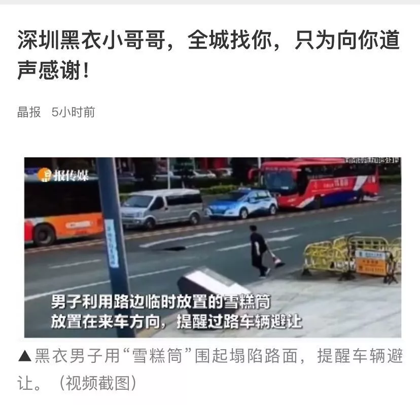 5月16日傍晚時分,一名身穿黑衣的青年男子經(jīng)過南山海德一路和后海濱路交匯處時發(fā)現(xiàn)路面有塌陷并出現(xiàn)不小的洞口,車輛擦邊迅疾而過險象環(huán)生,于是從路邊找來若干雪糕筒擺在洞口來車方向提醒司機繞洞而行,從而避免了交通事故的發(fā)生。