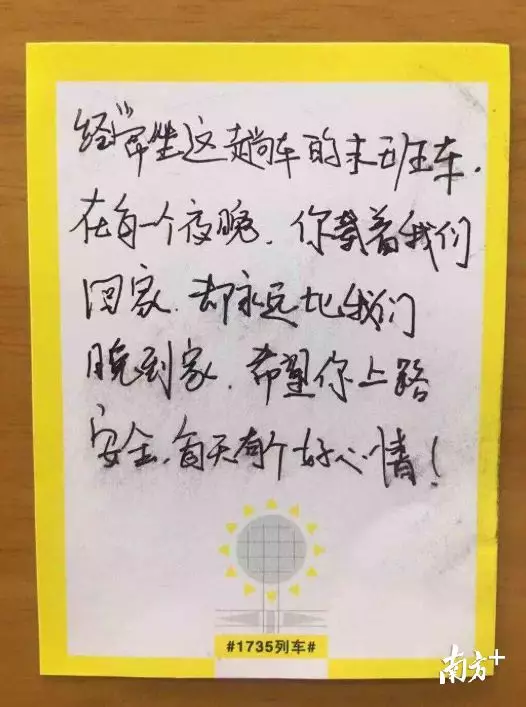 紙條上寫著:“經(jīng)常坐這趟車的末班車,在每個夜晚,你載著我們回家,卻永遠(yuǎn)比我們晚到家,希望你上路安全,每天有個好心情!”