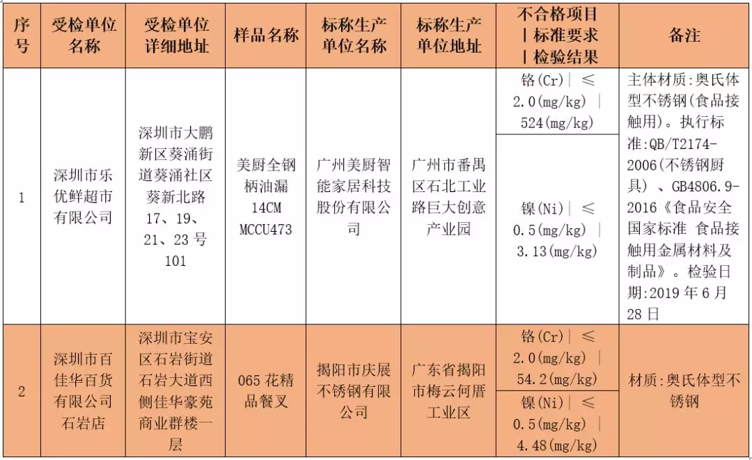 本次共抽檢生產(chǎn)及流通環(huán)節(jié)食品相關(guān)產(chǎn)品1174批次,涉及生產(chǎn)、流通環(huán)節(jié)經(jīng)營主體256家,共檢測相關(guān)指標(biāo)6822項次。其中檢出不合格樣品2批次,涉及2家受檢單位,均來自流通領(lǐng)域企業(yè);涉及不合格產(chǎn)品類別均為食品接觸用金屬材料及制品;涉及不合格項目均為鎳(Ni)、鉻(Cr)。