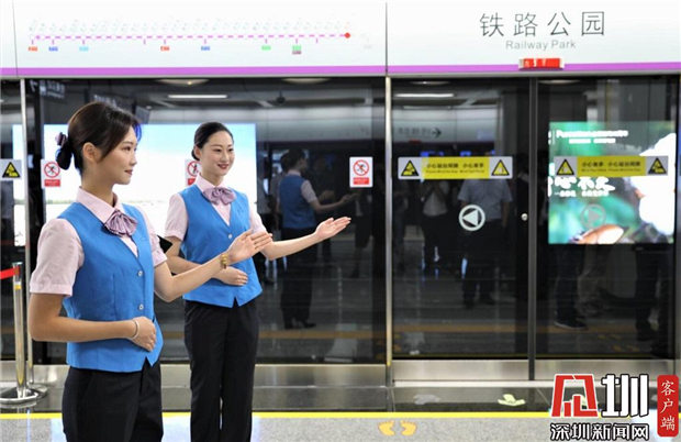 深圳地鐵5號線二期開通首日,地鐵工作人員歡迎市民乘坐地鐵。