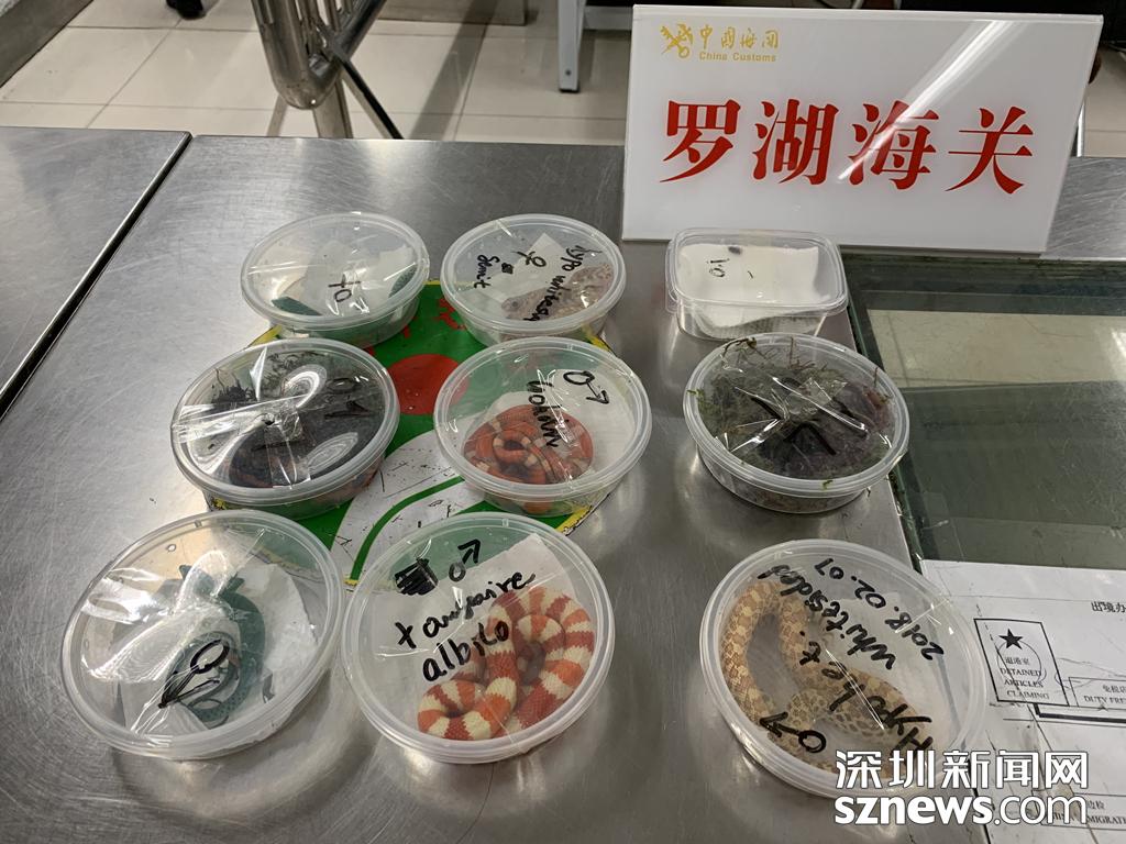 4月19日,一名旅客攜帶洪都拉斯奶蛇、龍紋翡翠蜥蜴等多個品種合計9只爬行綱動物自羅湖口岸入境,被深圳海關(guān)隸屬羅湖海關(guān)當場查獲。