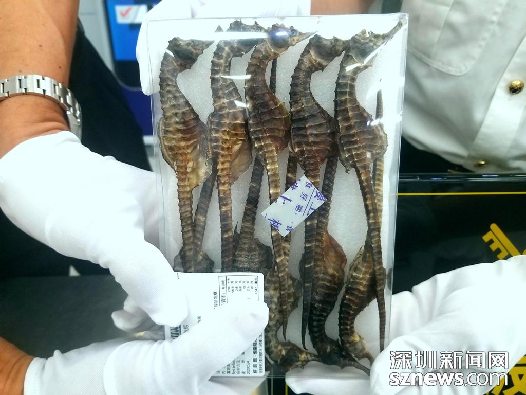 5月19日,一名中國籍旅客從深圳文錦渡口岸入境時,海關(guān)關(guān)員在其行李中共查獲干海馬10只,長度約20公分,總重40克。