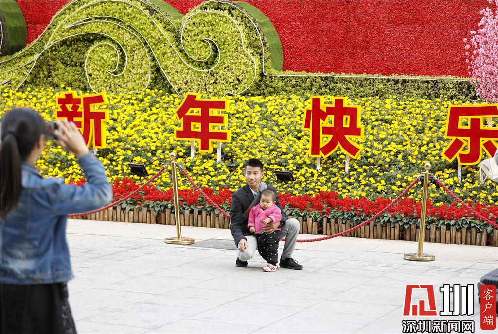 深圳北站東廣場(chǎng),一位家長(zhǎng)和孩子在“新年快樂(lè)”的牌子前合影留念。