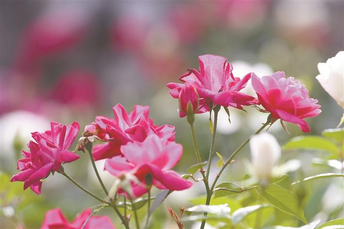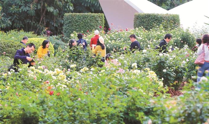 人民公園月季花展吸引眾多市民賞花。