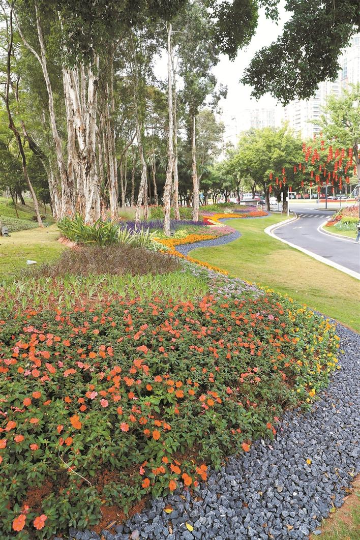 走出公園,深圳街頭,一條條花景大道移步換景。深南大道中間綠化帶已完整呈現(xiàn)鳳凰飛羽圖案,以紅色的鮮花為主調(diào),花帶大氣流暢,姹紫嫣紅,是深圳打造世界著名花城的風(fēng)采展示。
