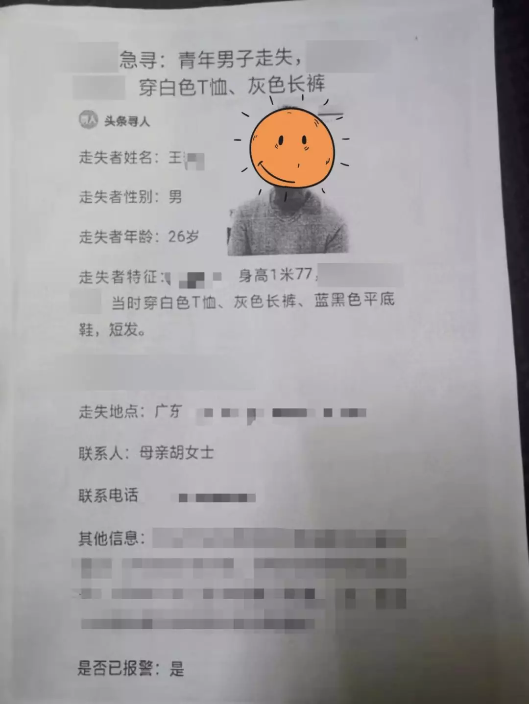 “找著了!找著了!”1月20日下午17時許,自1月13日走失的患病青年男子,在深圳某中學(xué)附近天橋平安找回,此時,離走失人員父母到福田派出所報(bào)案,不到30分鐘找回走失人員!