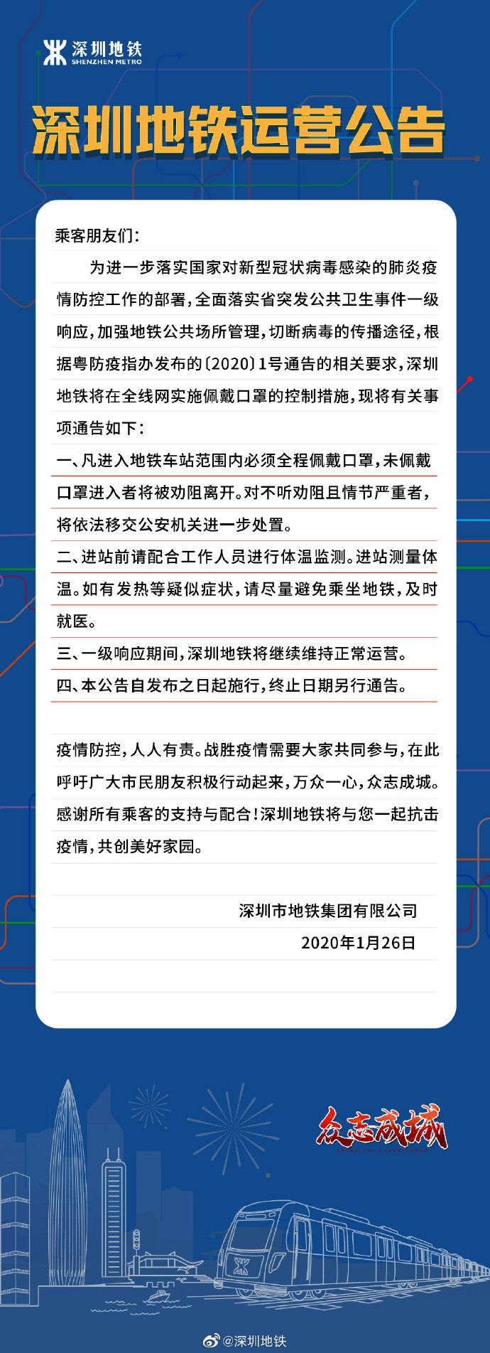 見圳客戶端·深圳新聞網2020年1月27日訊 深圳地鐵官方微博1月26日發(fā)布運營公告:根據粵防疫指辦發(fā)布的〔2020〕1號通告的相關要求,為全面落實省突發(fā)公共衛(wèi)生事件一級響應,加強地鐵公共場所管理,切斷病毒的傳播途徑,即日起,凡進入地鐵車范圍內必須全程佩戴口罩,未佩戴口罩進入者將被勸阻離開。對不聽勸阻且情節(jié)嚴重者,將依法移交公安機關進一步處置。
