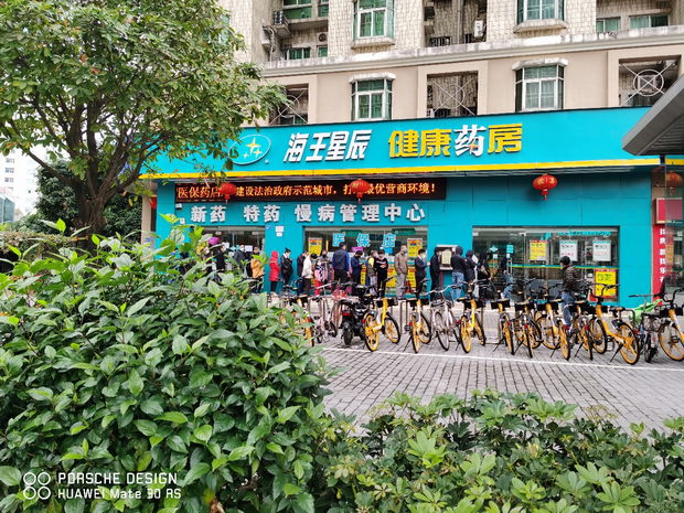 景田海王星辰藥店門口,深圳市民戴口罩排隊(duì)購(gòu)買口罩等防控物品。(蔣溪林 攝)