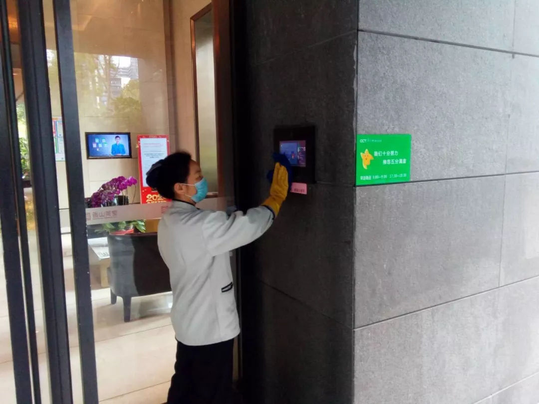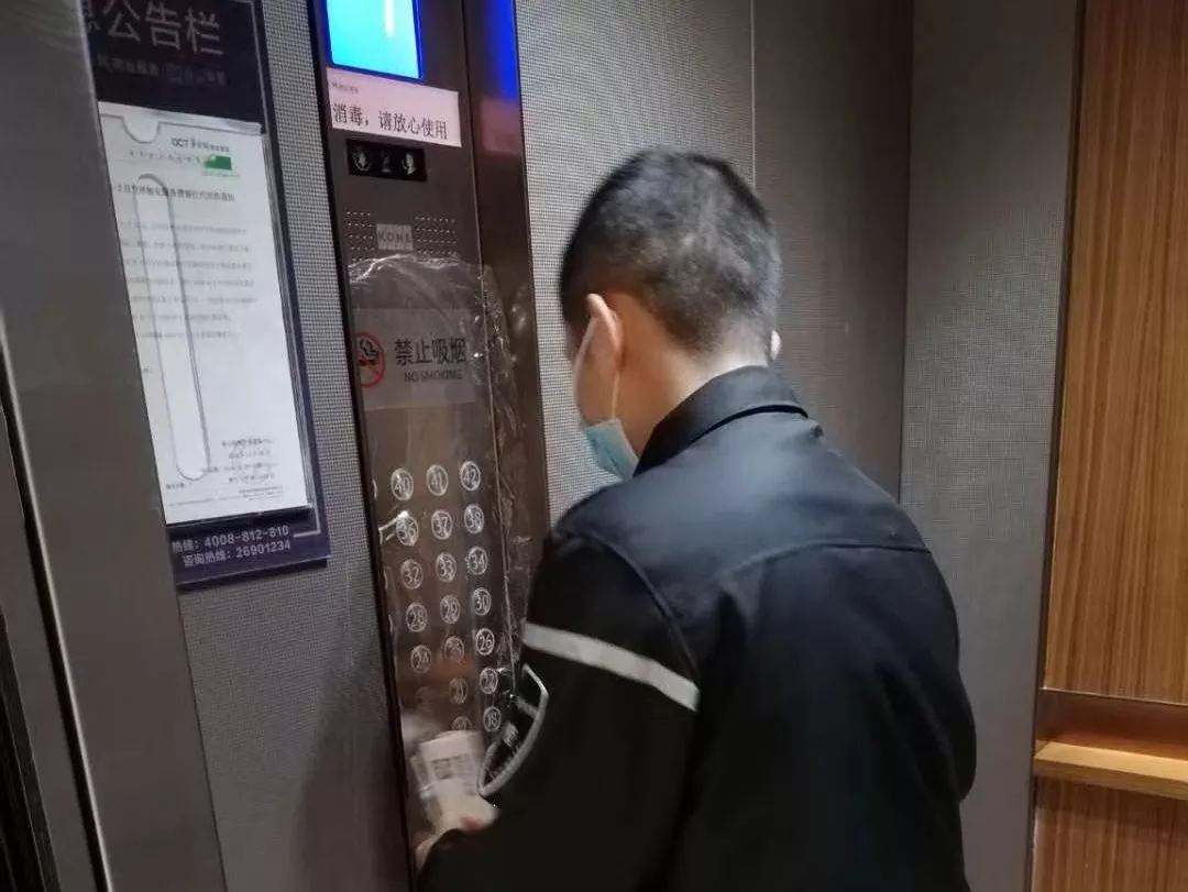 每天對小區(qū)公共區(qū)域大堂門把手、門禁對講機、電梯按鍵、大堂茶幾沙發(fā)等高頻接觸區(qū)進行消毒及對轎廂按鈕定時更換保鮮貼膜。