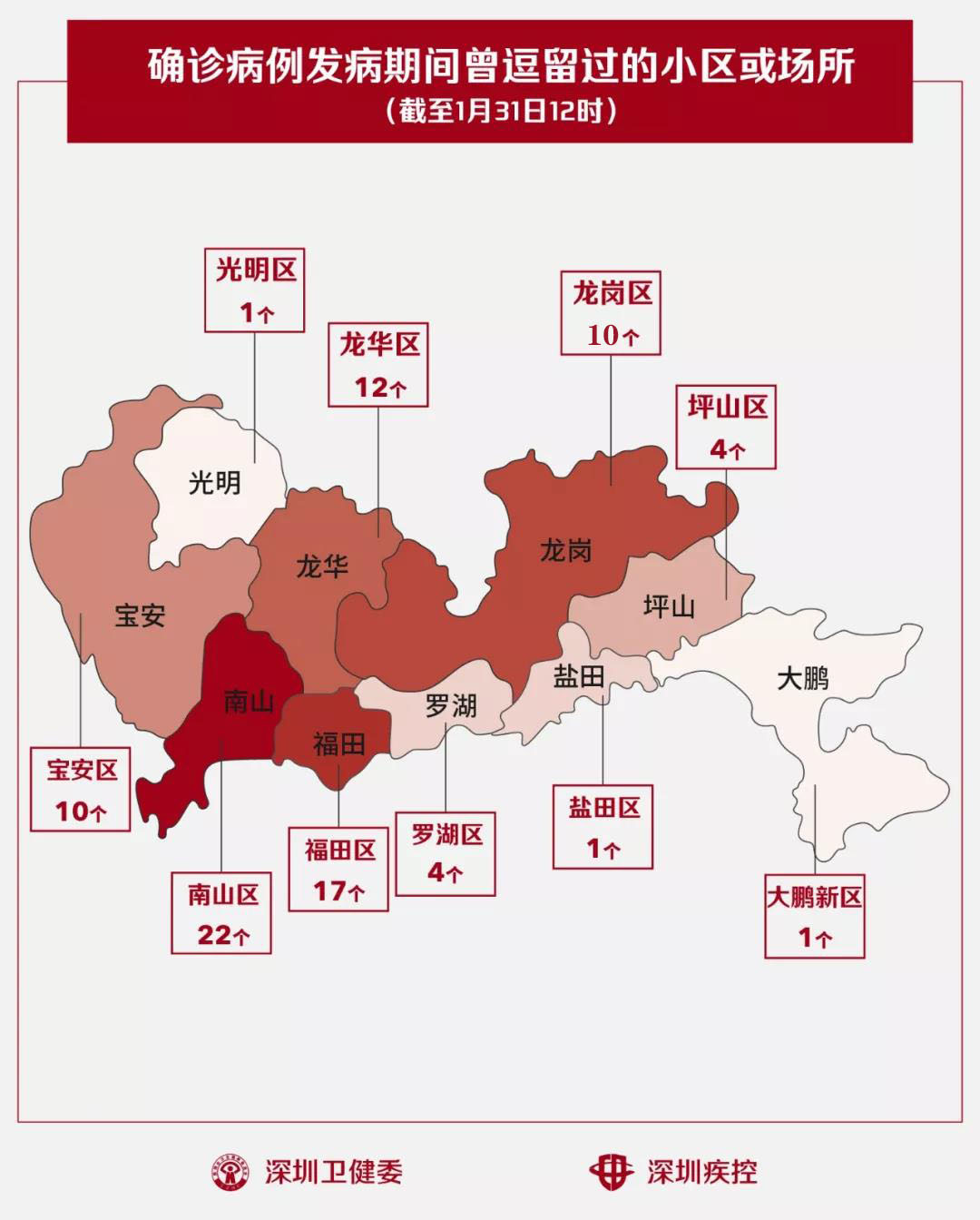 截至1月31日12時,深圳累計確診的134個“新型肺炎”患者,曾在出現(xiàn)病征期間逗留過以下82個場所,其中有部分地方同時出現(xiàn)了多個病人(主要是一個家庭內(nèi)有多人發(fā)?。?。
