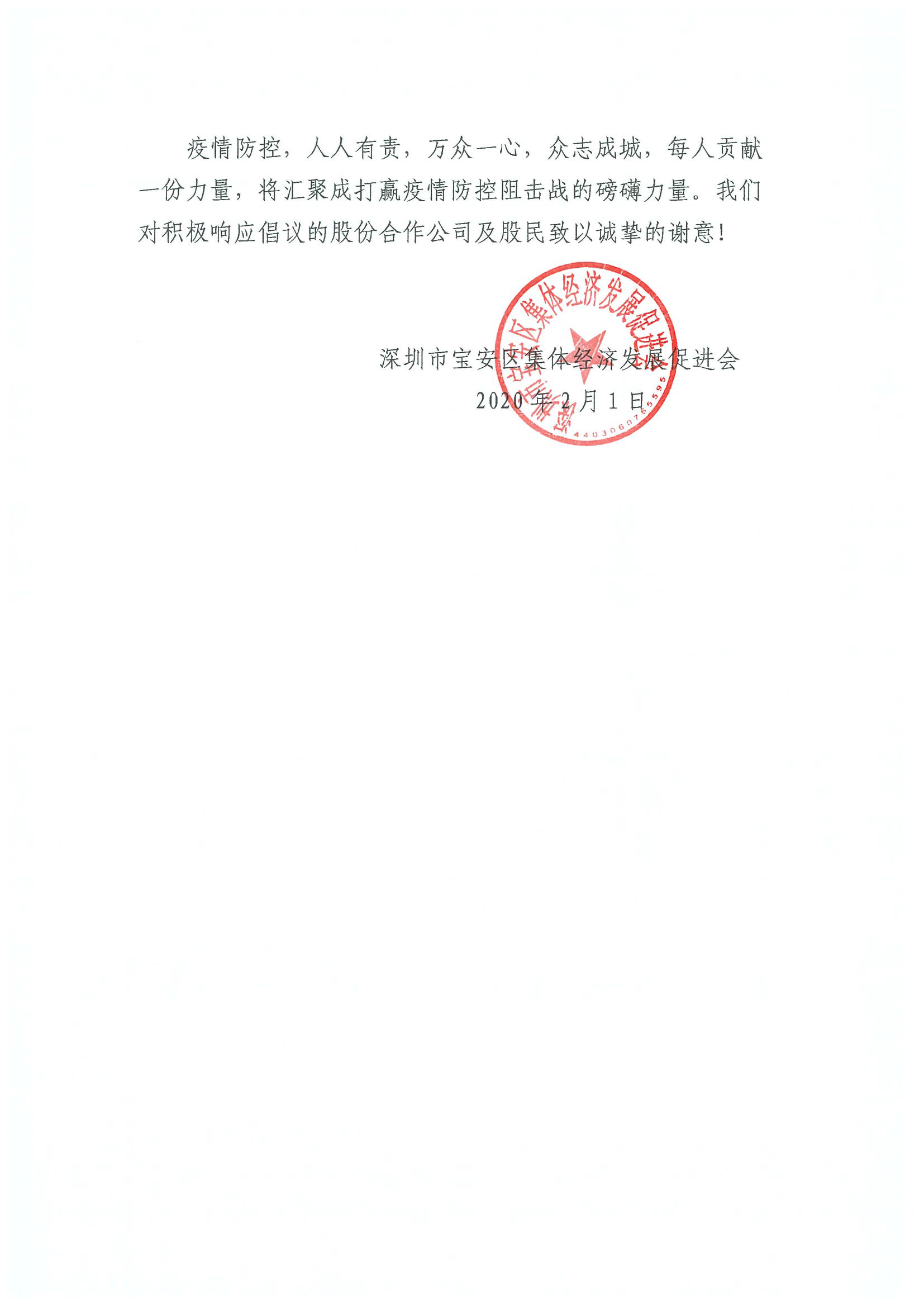 深圳新聞網(wǎng)寶安訊 “疫情防控,人人有責(zé),萬眾一心,眾志成城,每人貢獻(xiàn)一份力量,將匯聚成打贏疫情防控阻擊戰(zhàn)的磅礴力量?!?月1日晚,寶安區(qū)集體資產(chǎn)管理局指導(dǎo)寶安區(qū)集體經(jīng)濟(jì)發(fā)展促進(jìn)會向?qū)毎矃^(qū)各社區(qū)股份合作公司、全體股份合作公司股民發(fā)出《同心協(xié)力共克時(shí)艱適當(dāng)減免企業(yè)及來深務(wù)工人員租金的倡議書》,號召全區(qū)股份合作公司及股民適當(dāng)減免企業(yè)及來深務(wù)工人員15-30天租金及物業(yè)費(fèi),并根據(jù)疫情防控的需要可再次追加減免。