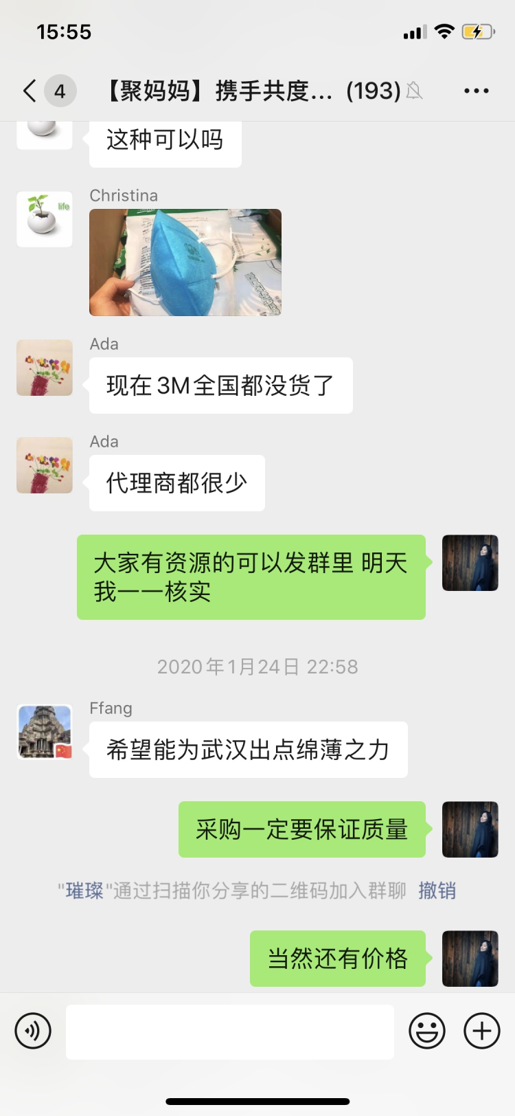 這一百多名媽媽是一個(gè)名為“聚媽媽攜手共渡難關(guān)”(以下簡(jiǎn)稱“聚媽媽”)微信群的成員,Miya是“聚媽媽”的發(fā)起人之一。1月24日除夕那天,Miya與一位朋友聊起疫情,兩人都覺得,醫(yī)院缺物資,一兩人的力量又太單薄,不如發(fā)動(dòng)朋友們一起購買直接送到醫(yī)院。Miya在當(dāng)晚9點(diǎn)左右建了這個(gè)臨時(shí)群,并邀請(qǐng)周圍熟識(shí)的朋友加入。