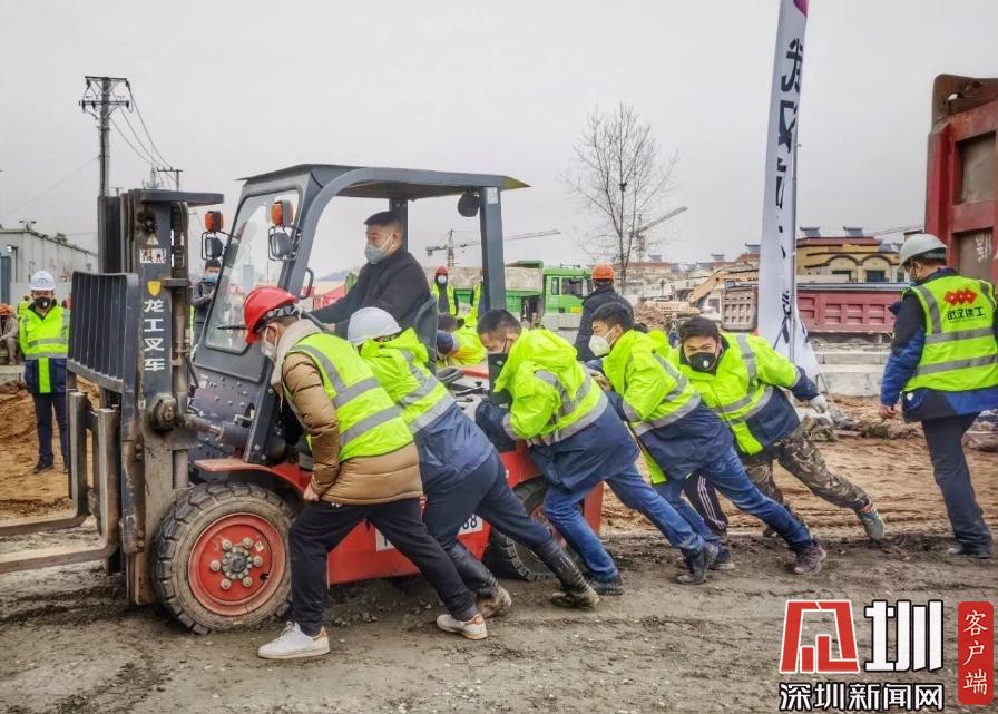 恰逢雨天,道路泥濘。運(yùn)送重型設(shè)備的叉車陷入呢泥潭,眾人協(xié)力推車。(邁瑞醫(yī)療供圖)