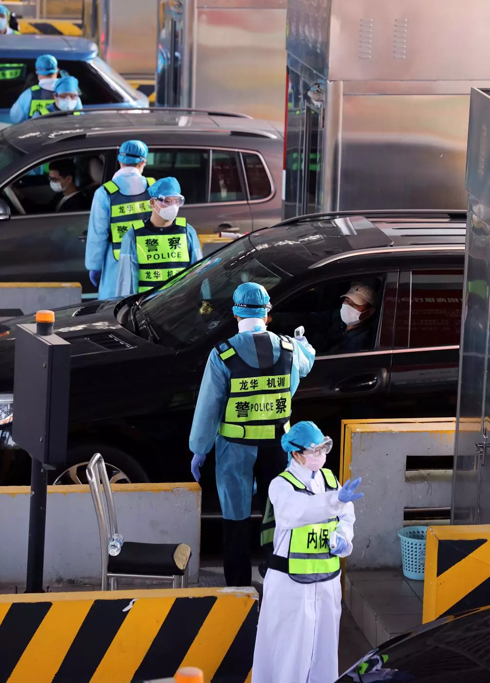 執(zhí)勤民警協(xié)助醫(yī)務(wù)人員對(duì)入深車(chē)輛上的人員進(jìn)行體溫檢測(cè)。
