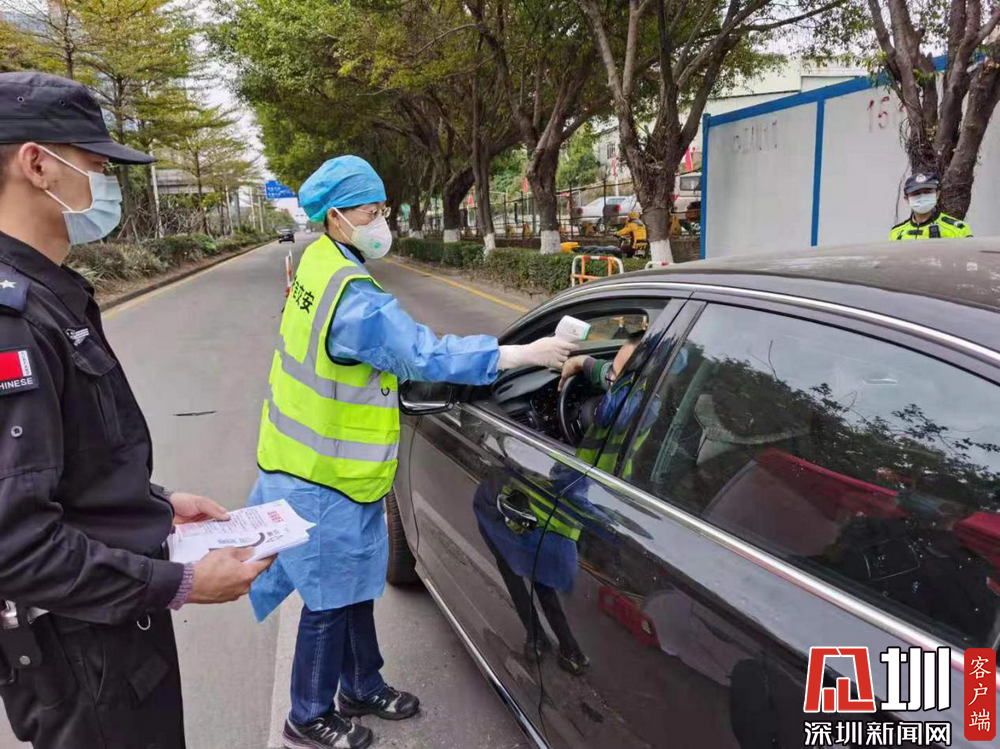 圖說:協(xié)同合作,街道同志測體溫,公安同志派發(fā)溫馨提示。
