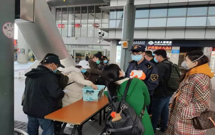 口岸工作人員正在對(duì)來往旅客進(jìn)行疫情防控知識(shí)宣傳