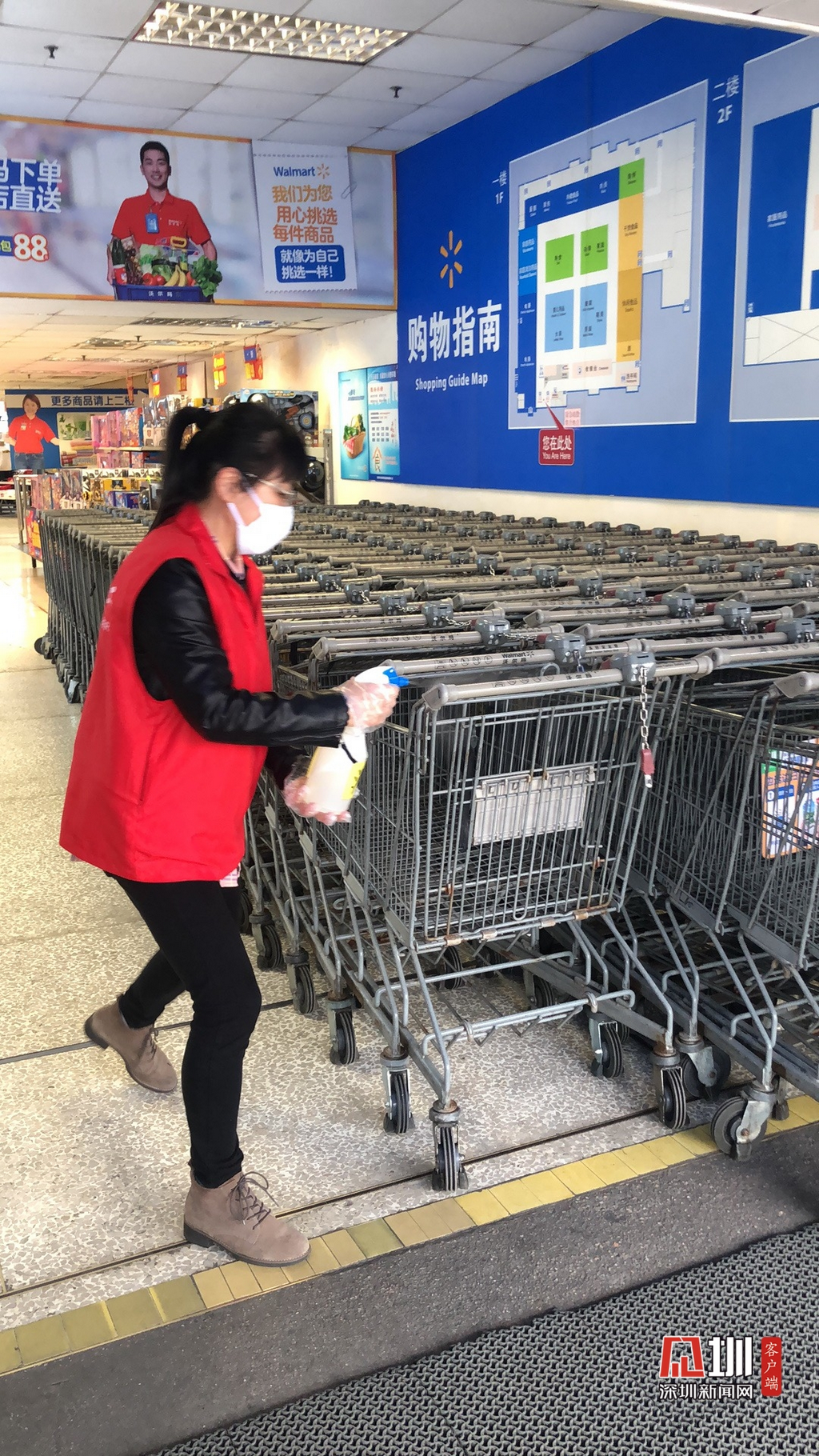 在消毒方面,景田北沃爾瑪超市每天對超市進(jìn)行高頻次消毒,包括購物車、按鍵、門把手、出入口等人群經(jīng)常接觸的區(qū)域,并保持場所通風(fēng),增加空氣對流。