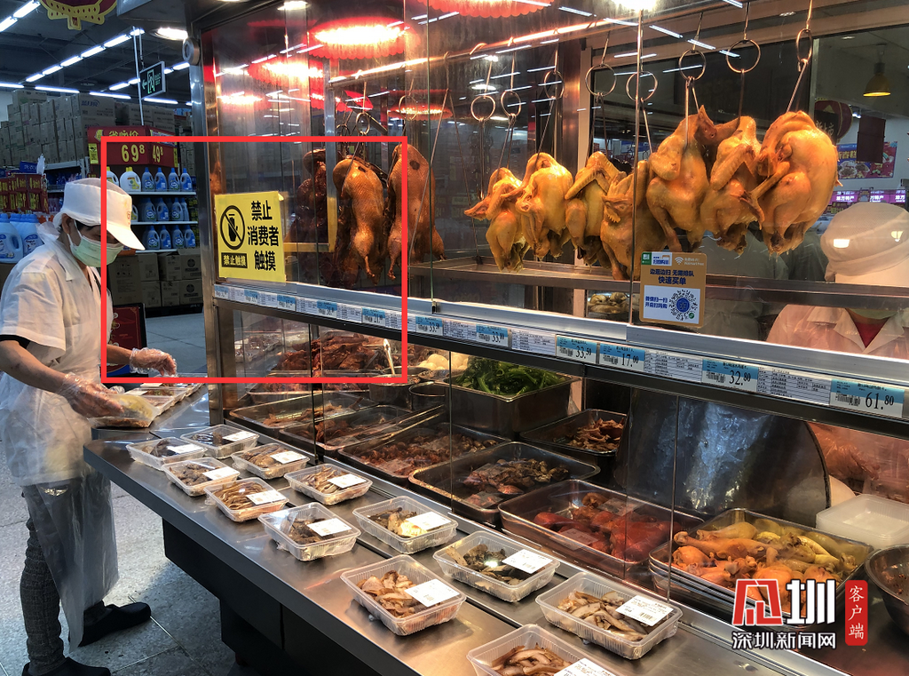 超市熟食區(qū)有明顯禁止消費者觸摸等標(biāo)志。