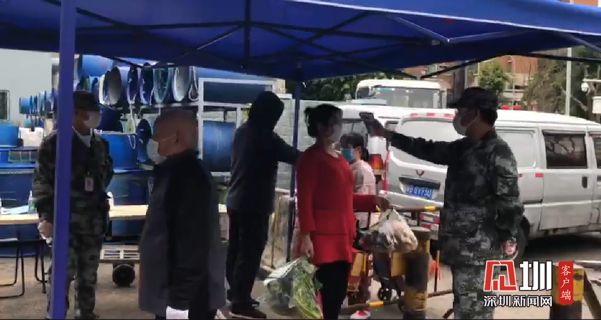 福田農(nóng)批市場出入口處配備專人進(jìn)行體溫測試。
