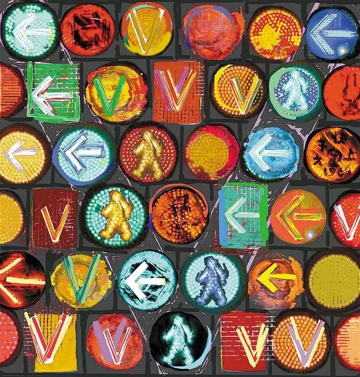 梁宇透露,這件作品的創(chuàng)作四易其稿,將信號燈所指代的“社會規(guī)則”加以排列強(qiáng)化,以此強(qiáng)調(diào)“秩序”本身在與疾病博弈混亂環(huán)境中的重要性。作品以濃烈的對比色彩、緊密排列的幾何圖形試圖傳達(dá)當(dāng)下人們的緊張情緒和焦慮心態(tài)。同時(shí),信號燈中“行走”、“前進(jìn)”、“Victory”的提示標(biāo)識,被清晰地提煉出來,成為能讓畫面安定的因素,望帶給觀者一點(diǎn)思緒的寧靜與心靈的慰藉。