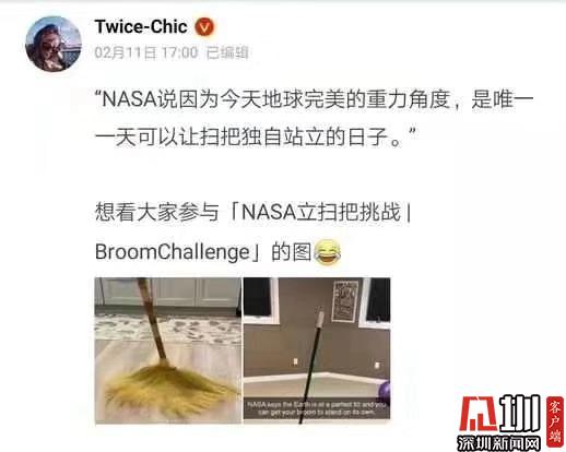 見圳客戶端·深圳新聞網(wǎng)2020年2月11日訊 (見圳客戶端、深圳新聞網(wǎng)記者 吳英敏)2月11日,有網(wǎng)友在微博曬出兩張掃把直立的照片:“宅在家里試了一下NASA立掃把挑戰(zhàn),據(jù)說一年中只有今天可以立起來,親測有效!”記者也在朋友圈發(fā)現(xiàn)許多朋友紛紛曬出掃把直立成功的圖片,有網(wǎng)友稱,“宅家立掃把”將全國人民心相連了!隨后,人民日報(bào)微博辟謠稱,真相是,掃帚能立起來與今天的引力無關(guān),每天都可以立,只要你能找到平衡!