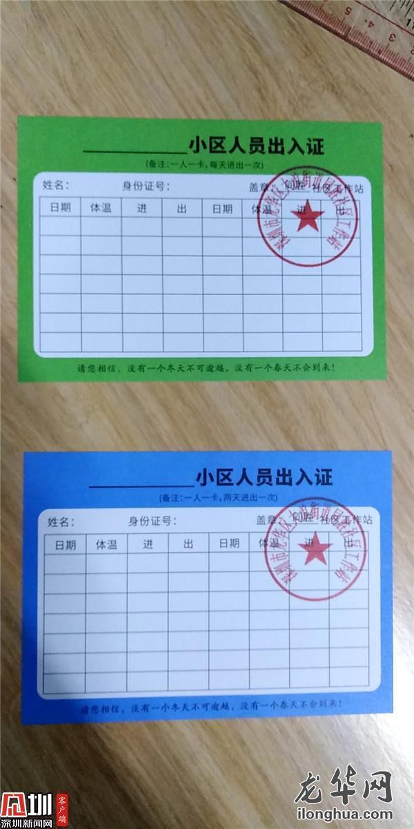 近日,根據不同居民的情況和需求,大浪街道用四種顏色的卡片對居民出入進行分類管理:紅色是有發(fā)熱等異常癥狀、按要求正在居家隔離的人員,黃色是來深14天內,正在居家隔離且無異常癥狀的人員,可視情況轉為其他管理模式。紅、黃兩類人員嚴禁其出門,由社區(qū)工作站提供物資采購、幫送服務。藍色是沒有居家隔離、身體狀況正常的在家人員,憑證可以兩天出入1次;綠色是沒有居家隔離、身體狀況正常的上班人員,憑證每天可以出入1次。