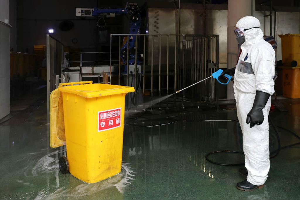 ▲卸完醫(yī)療廢物后,工作人員對(duì)堆放區(qū)域進(jìn)行消毒。