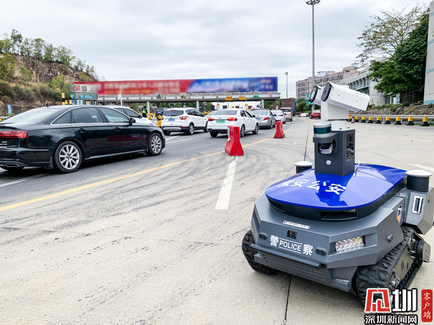 警用巡視機(jī)器人“建國”在深圳高速路口執(zhí)行巡邏任務(wù)。