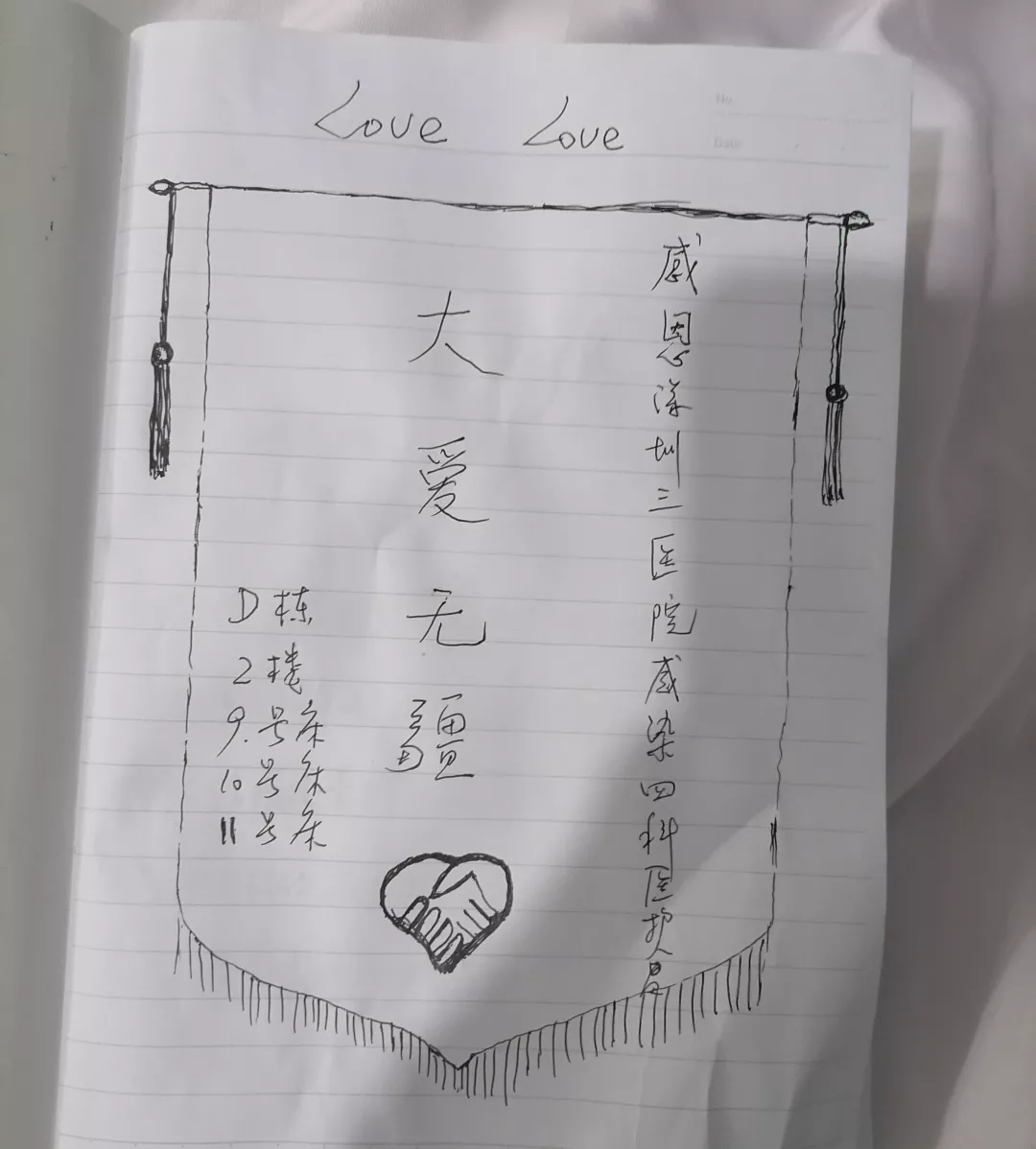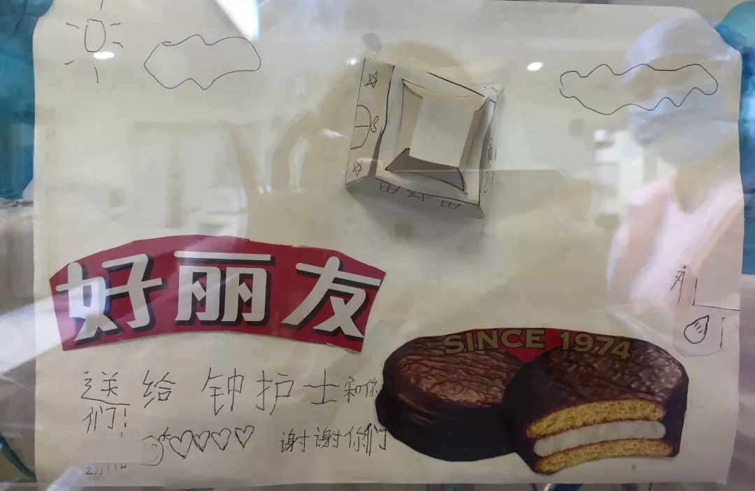 2月11日,深圳市三醫(yī)院兒科護(hù)士們收到了一個用好麗友餅干盒制作的手工賀卡,上面寫著“送給鐘護(hù)士和你們!謝謝你們”,賀卡上還畫了一張笑臉和四個心形。