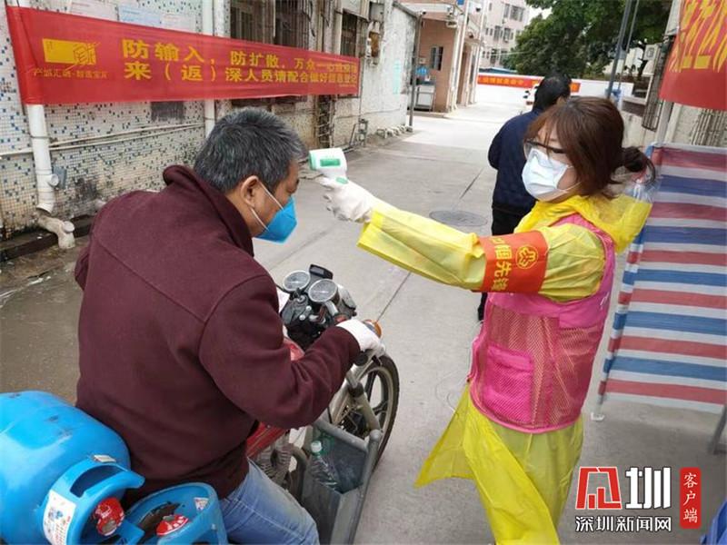 來自龍崗區(qū)南嶺村的鄧育芳,是不少租戶的房東,也是值守在南嶺南路黨員先鋒崗的一名村民志愿者。連續(xù)十多天,她每天在村口站立整整7個小時,不停為出入居民測量體溫、詢問來源地、查驗申報二維碼、引導注冊。