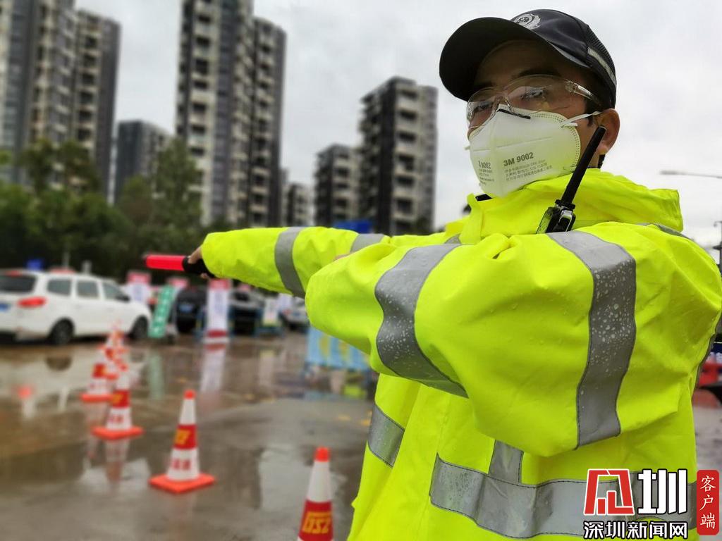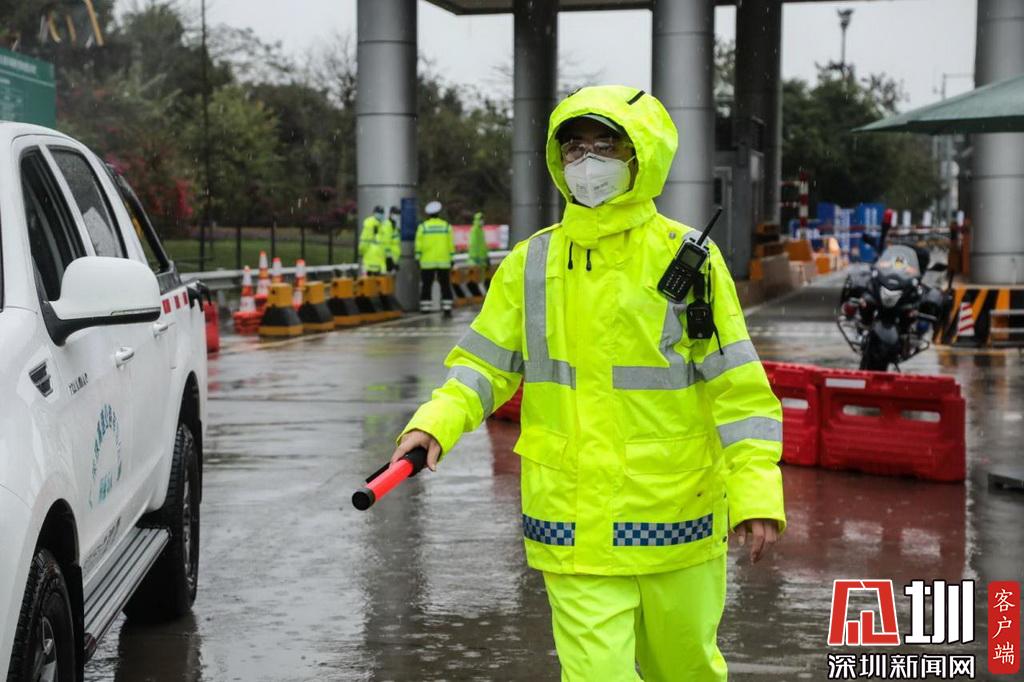 暴雨來(lái)臨,深圳交警民警在檢疫點(diǎn)安裝雨棚。