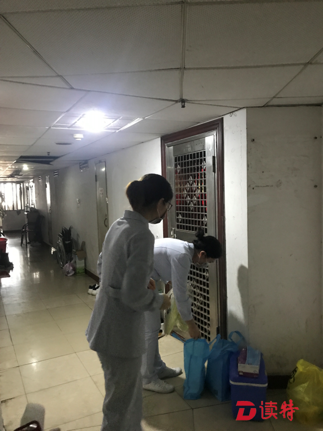 “不同戶換防護(hù)裝備,同戶換手套。”保證安全的同時(shí),為了最大限度減少防護(hù)裝備的使用量,在為同一戶的不同居民進(jìn)行采樣時(shí),工作人員會(huì)更換手套和頻繁消毒,完成一戶時(shí),才會(huì)更換防隔服等防護(hù)裝備。