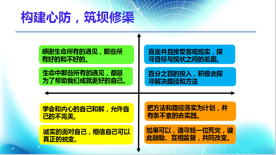 所有的消極情緒都是外面?zhèn)鬟f進(jìn)來的,而所有的積極情緒都是自己構(gòu)建的,面對消極情緒,我們要相信自己,通過理性的思考找到適合自己的解決辦法。有這樣一句話:“這個世界上所有偉大的事情都特別簡單,而簡單的事情最是難以堅持。”只要確定目標(biāo)并堅持下去,相信你會得到自己想要的結(jié)果。