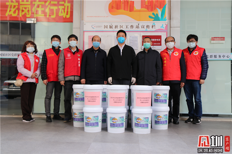 深圳市人大代表、廣東吉明玻璃工程有限公司總經(jīng)理吳冰向國展社區(qū)工作站熱心捐贈消毒液等物資。