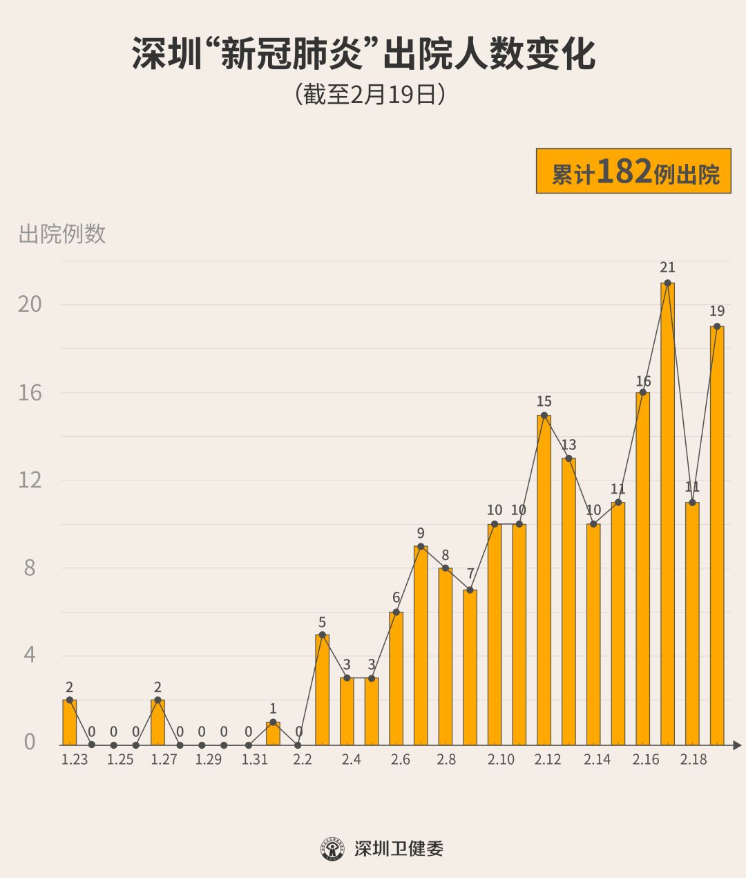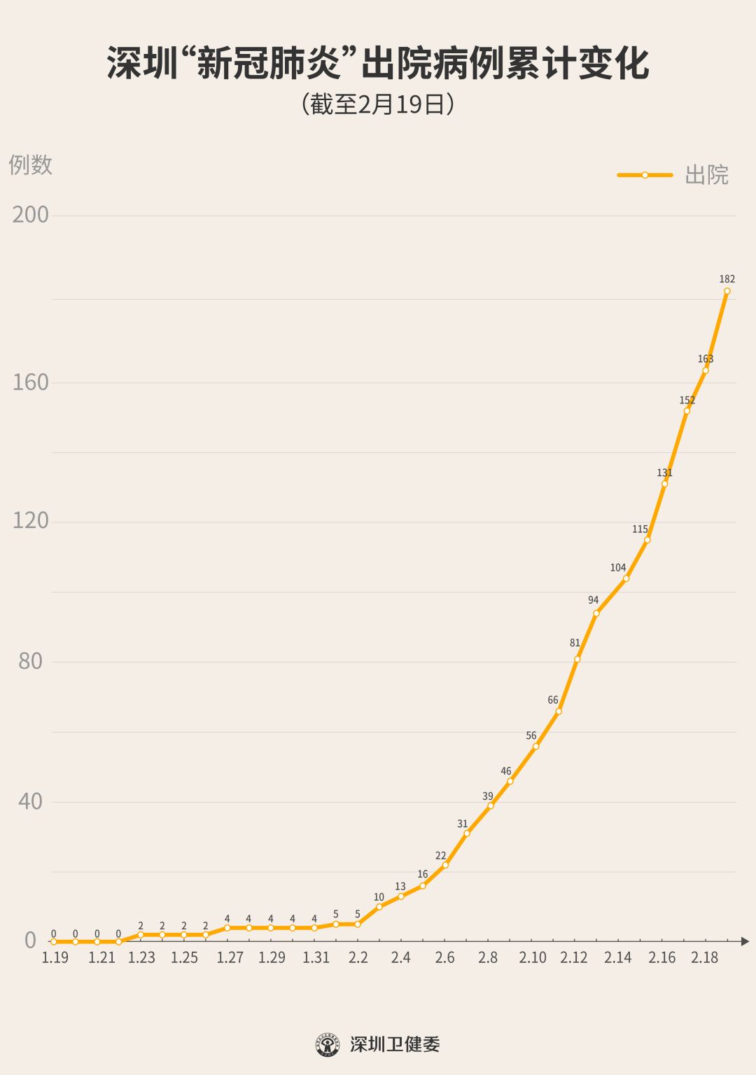 2月19日下午,經(jīng)專家組會(huì)診,深圳再有19名新型冠狀病毒肺炎確診患者出院,累計(jì)達(dá)182人,連續(xù)17天有人出院。