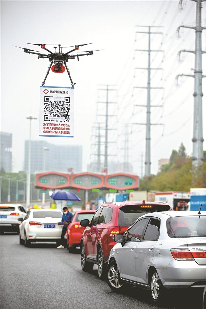 2月11日,在G94高速深圳觀瀾收費(fèi)處,深圳龍華機(jī)訓(xùn)大隊(duì)無(wú)人機(jī)飛行隊(duì)的民警操作懸掛有申報(bào)二維碼的無(wú)人機(jī)在候檢的車輛間飛行。晶報(bào)記者賴?yán)鐢z