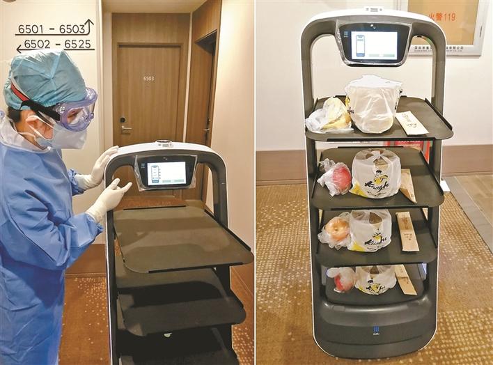 左圖是醫(yī)護(hù)人員在深圳市福田區(qū)華富街道健康驛站介紹送餐機(jī)器人;右圖是依次擺好在機(jī)器人托盤(pán)上的食物(2月7日攝)。新華社發(fā)