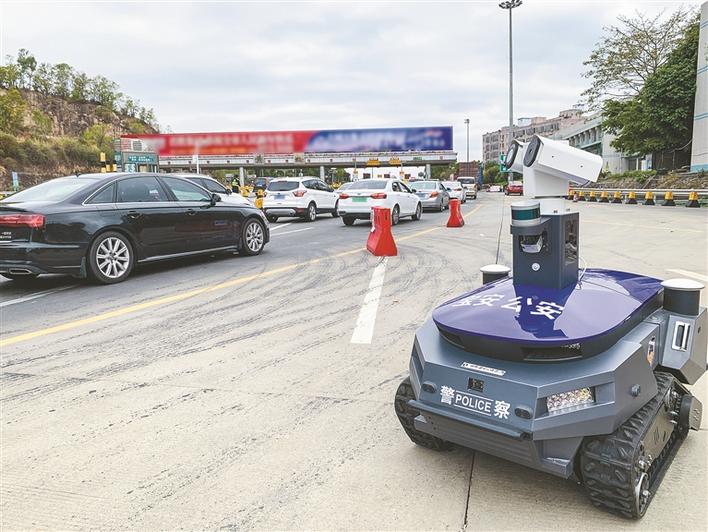 警用巡視機(jī)器人“建國(guó)”在深圳高速路口執(zhí)行巡邏任務(wù)。
