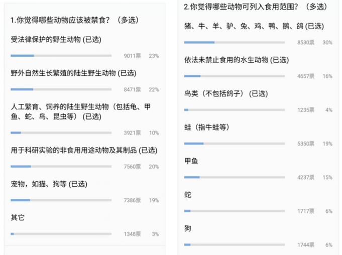網友投出9011票,贊成“受法律保護的野生動物”應該被禁食,占比23%;另有8471票,22%的網友支持禁食“野外自然生長繁殖的陸生野生動物”。對于“用于科研實驗的非食用用途動物及其制品”選項,有20%的網友(7560票)支持禁食。禁食的投票選項中,還有19%的網友贊成禁食貓狗等寵物(7386票),10%的網友贊成禁食包括龜、甲魚、蛇、鳥、昆蟲等人工繁育、飼養(yǎng)的陸生野生動物,票數為3921票。
