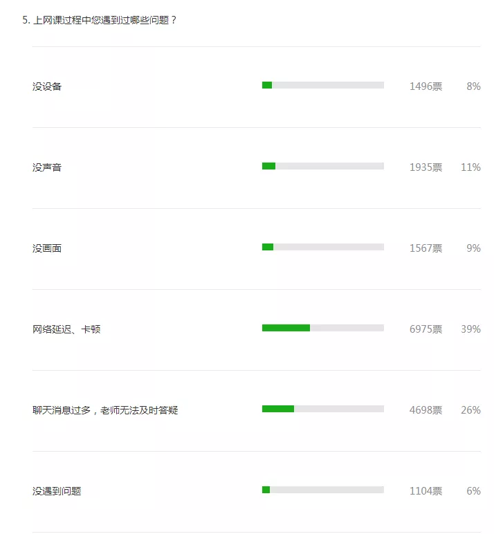僅有6%的參與者在網(wǎng)課中從未遇到障礙。39%的參與者曾遇到網(wǎng)絡(luò)卡頓、延遲的問題,20%的參與者曾遇到網(wǎng)課沒聲音、沒網(wǎng)絡(luò)等問題。