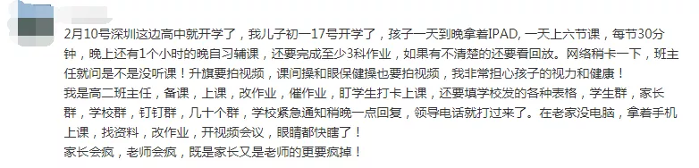 許多家長對孩子視力十分擔(dān)憂。持該意見的家長認(rèn)為,目前網(wǎng)課使孩子使用電子設(shè)備時間過長,對孩子視力造成不小影響。一位高二班主任老師也表示,不僅學(xué)生的視力受到影響,老師也要每天長時間面對著手機(jī)和電腦,眼睛的健康難以保證。