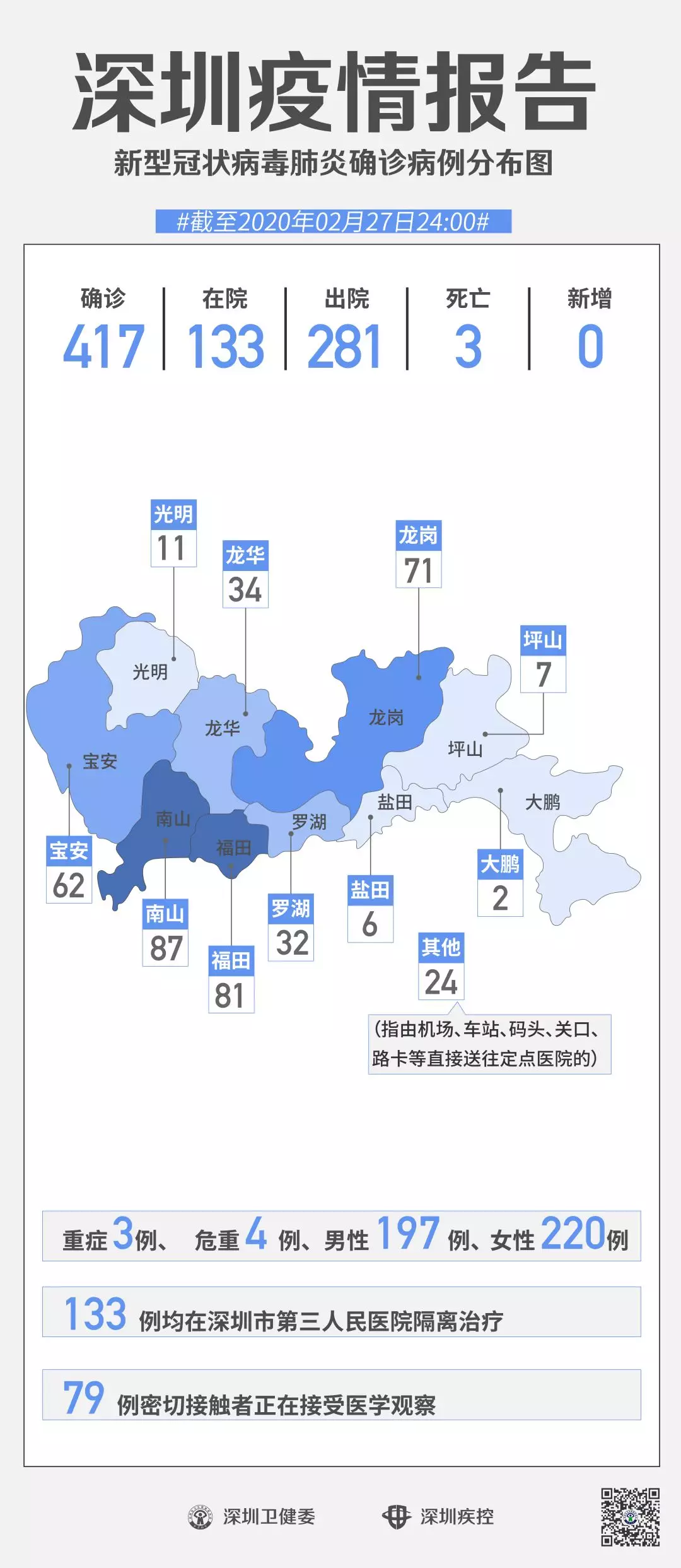 截至2月27日24時(shí),深圳累計(jì)報(bào)告“新冠肺炎”確診病例417例。2月27日當(dāng)天全市無新增確診病例,當(dāng)天出院病例10例(從26日起不再公布出院個(gè)案)。