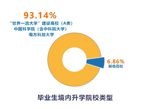 而境內(nèi)升學(xué)中,去往雙一流高校以及中國(guó)科學(xué)院(含中科院大學(xué))、南科大的畢業(yè)生占了絕大部分。其中,到清華大學(xué)和北京大學(xué)升學(xué)的共計(jì)13人,7人攻讀碩士學(xué)位,6人攻讀博士學(xué)位。