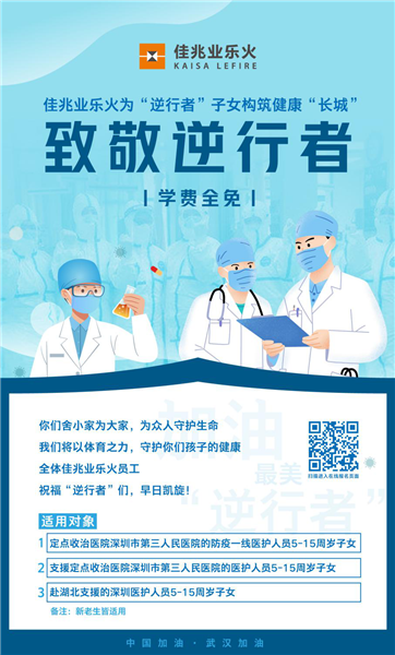 見圳客戶端·深圳新聞網(wǎng)2月29日訊(見圳客戶端、深圳新聞網(wǎng)記者 李云云 通訊員 張慧)突如其來的新冠肺炎疫情牽動著人們的心,在這場沒有硝煙的戰(zhàn)斗中,廣大醫(yī)護人員舍小家為大家,日夜沖鋒守護在一線,成為這個特殊春節(jié)里最美的“逆行者”。日前,記者獲悉,佳兆業(yè)文體集團旗下的佳兆業(yè)樂火國際文體學校將于3月1日到12月31日,為深圳定點收治醫(yī)院——深圳市第三人民醫(yī)院的防疫一線醫(yī)護人員以及赴鄂支援的深圳醫(yī)護人員子女提供免費培訓課程包,為“逆行者”子女構(gòu)筑健康“長城”。