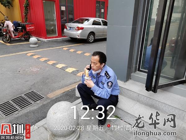做完返深隔離人員沿途消殺工作,早已錯過飯點,記掛著接下來的種種工作,他轉身去便利店買了個面包,坐在店門口的臺階上,隨便對付一下。簡單潦草的一頓午餐,卻是他難得的歇息片刻。