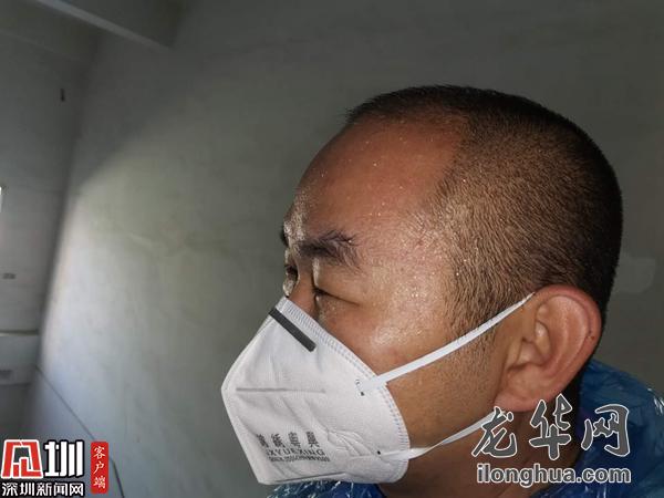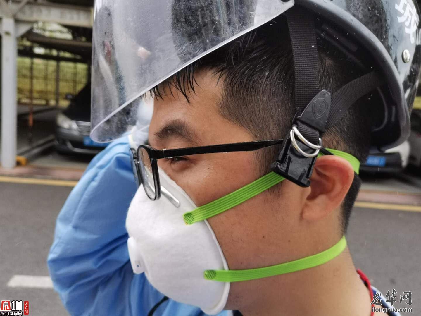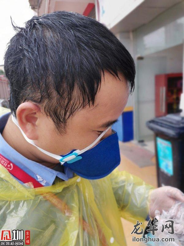 接到有返深人員的通知,他立刻帶隊趕往現(xiàn)場,多次測溫后仍體溫偏高,他不放心地叫來三位一體人員,一番確認之后,將發(fā)熱人員送往醫(yī)院,他則獨自善后對樓道進行消毒,將近兩個小時的折騰,他終于得以到垃圾桶旁邊喘口氣。額頭勒出的印痕和黏在后背的制服,都是每一天的勛章。