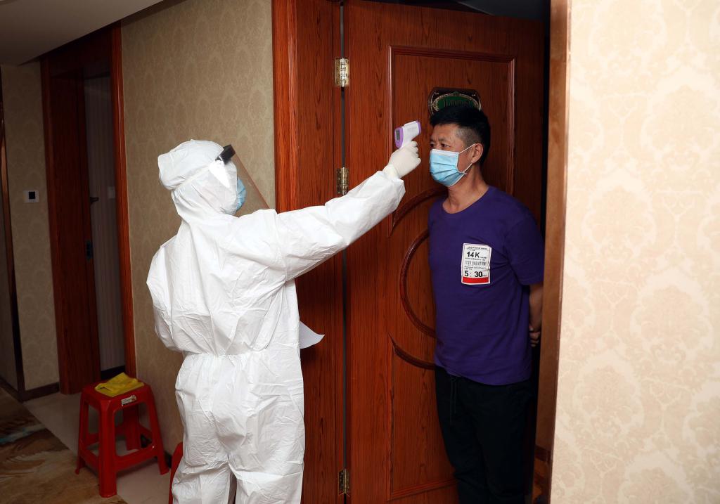 ▲醫(yī)護(hù)人員給南園街道健康驛站的臨時(shí)醫(yī)學(xué)觀察人員測(cè)量體溫。楊少昆攝
