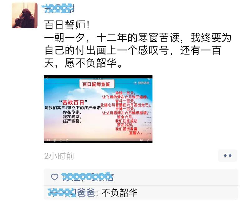 “生于非典,考于新冠,2020,我們注定不凡!疫情當前,雖然我們隔離在家,不能像往屆那樣,齊聚學校體育館舉行誓師大會,意氣風發(fā)地走進學校精心準備的“成功門”,伴隨奮進的樂聲高喊出我們的誓言,在“簽名紀念墻”上寫下對未來的期盼。但即使相隔網絡兩端,我們依然有老師祝福和引導,有家長的鼓勵和支持,有同窗的幫助和陪伴,高考百日,我們仍在一起振臂高呼:2020高考,我們準備好了。”