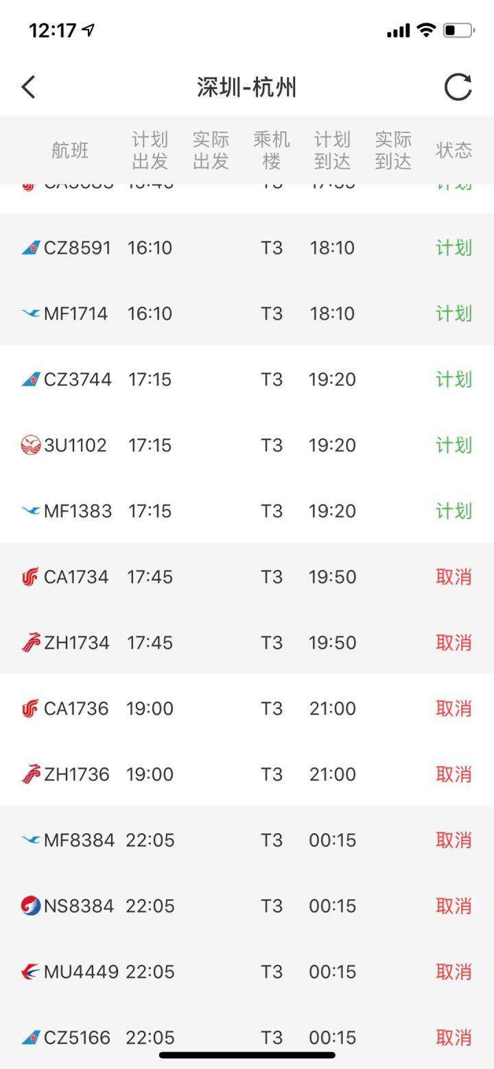 今天17:15后,深圳、廣州飛往杭州航班全部取消,部分因“公共安全原因”取消